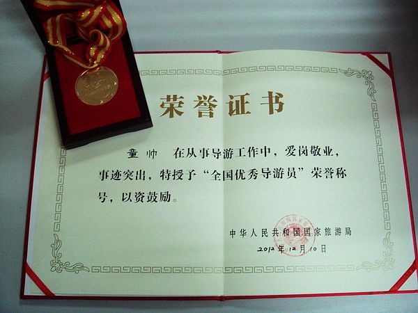 沈陽青旅員工童帥,在從事導(dǎo)游工作中,愛崗敬業(yè),實績突出,被中華人民共和國國家旅游局授予“全國優(yōu)秀導(dǎo)游員”榮譽稱號。